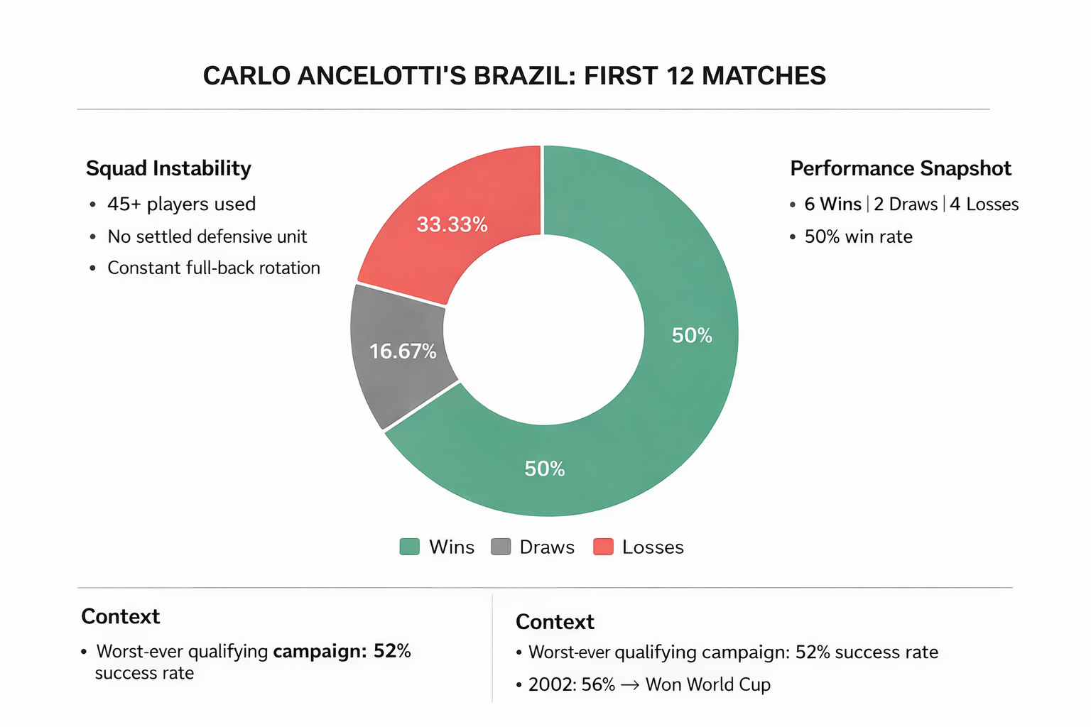 Brazil qualified for the 2026 World Cup. They are the only nation to have appeared at every edition since 1930. Ancelotti did not break that streak. But they finished fifth in the South American qualifying table — their worst-ever qualifying campaign, with a 52% success rate across the entire cycle. It is worth noting, with a kind of morbid irony, that their second-worst campaign — 56% in 2002 — ended with them lifting the trophy.